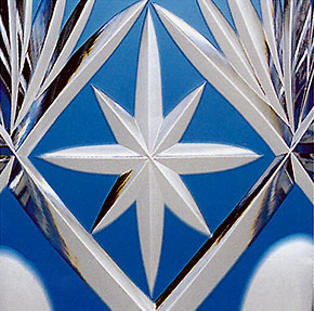 カットとは、ガラスの表面を各種のグラインダーで削って、幾何学的なパターンを彫り込む技法で、基本的には菱カット、カマボコカット、角山カットの3種類で構成されています。カットはクリスタルガラスの17世紀後半、イギリスで発明された鉛クリスタルの光沢とカット部分の反射の美しさを巧みに生かした製品を創り上げ、たちまちヨーロッパ全土を風靡しました。以来、今日に至るまで、カットは鉛クリスタルの最も主要な加工技術として、不動の地位を占めています。カットグラスのクリスタルは、光線屈折率の大きいもの、つまり良質のものでなければせっかくの技術が引き立ちません。カガミクリスタルのカットグラスの彫りの深さ、精密さやシャープさ、デザインの格調の高さは、戦前からすでに定評あるところです