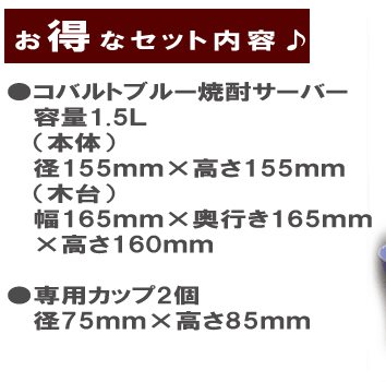 | (4)焼酎サーバーと木台・専用カップが2個も付いた超お得なセット内容 |