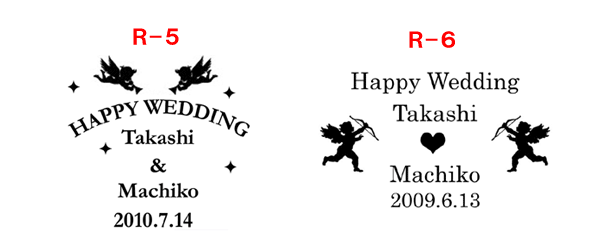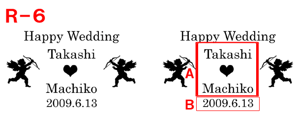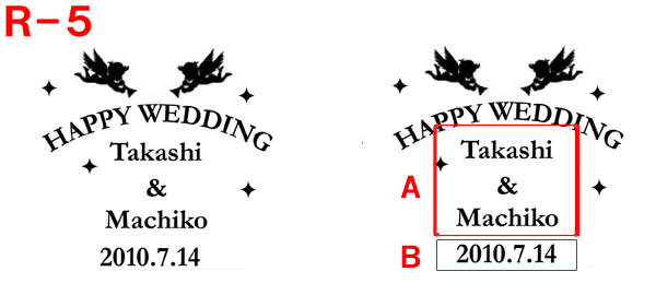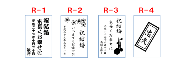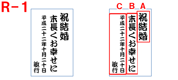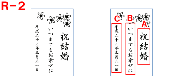 「A」「B」「C」の3つの文字入れ内容をご記入ください。 【パターン R-1・R-2・R-3の例】 A:祝結婚(8文字まで) B:いつまでもお幸せに(8文字まで) C:平成二十二年八月二十五日(日付以外でもOKです) 親友一同(6文字まで)