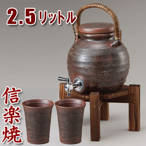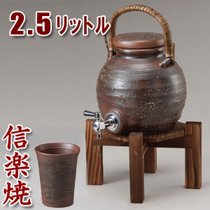 信楽焼 焼酎サーバー 手付きサーバー 2L(焼杉木台付き)・焼酎カップ2個付き