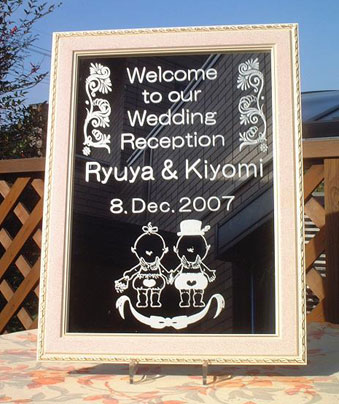 披露宴でゲストをお迎えする人気の高いミラーウェルカムボード♪真新しいミラーボードに専門の職人が手間暇かけて一つ一つ丁寧に彫刻をしていきます☆挙式後、家に持って帰ればいつでも幸せな気持ちを思い出せます♪